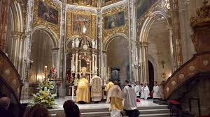 La catedral era el centro de la vida sacramental que, desde el bautismo hasta el viático, acompañaban toda la vida terrenal. En ella, en torno al Misterio de los misterios, la Santa Misa, se encontraban todas las artes ordenadas: riquísimo mobiliario litúrgico, cortinas de lienzos con los colores litúrgicos que poco a poco dejaría paso a tapices, luego a la pintura y a increíbles retablos que permitieron el desarrollo de la escultura y la pintura. Los impresionantes atriles de los coros y sus asientos, la magnífica caligrafía y artesanado de los libros litúrgicos, competían con el arte de los orfebres al servicio de cálices y otros ornamentos, o con los artesanos de los vitrales o los esmaltistas. Primero el canto gregoriano y luego el polifónico, expresaron la armonía que se podía contemplar en las arquivoltas de piedra o en la elevación de la hostia consagrada que unía el cielo y la tierra. De los grandes tiempos litúrgicos se recuperó un arte prácticamente desaparecido que era el teatro, para representar los “tiempos fuertes” en las catedrales. Puede decirse que: “Todas las artes que se cobijaban en la catedral tomaban parte conjunta en la realidad mistérica de sus celebraciones, y es en su transcurso cuando mostraban especialmente la vitalidad que las animaba. La catedral sacaba a flor de piel la plenitud de sus virtualidades en ocasión de las grandes fiestas, en el esplendor de la sagrada liturgia, por ejemplo, el día de la Vigilia Pascual, o cuando se llevaba a cabo la consagración del rey”[16].